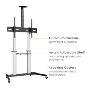 Get the FS44-610TW TV Cart for an affordable, high-quality solution. Its adjustable height, built-in cable management, and lightweight aluminum column make it ideal for any space. The cart also features an attached shelf, 4 locking casters, and reliable durability. Choose it to win!