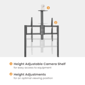 The TTL16-69FW Cost-Effective Heavy Duty TV Cart features an adjustable camera shelf for easy equipment use, additional storage shelves, four lockable casters for mobility and stability, and cable clips for tidy cable management, this TV cart is the perfect blend of style and functionality. Ideal for any TV station environment.