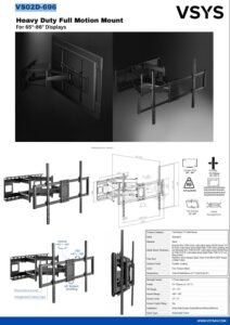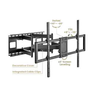 Heavy-duty arms provide strong support for larger and heavier TVs up to 120kg, it basically holds all types of TVs from 60” to 120”. TV installation and removal are made easy through a unique quick-release mechanism. Toolless tilting delivers optimal viewing angles. Integrated cable management creates a clean appearance.