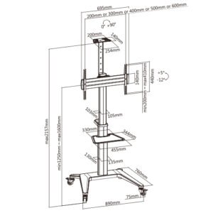 TTV12-46TW comes with an ultra-strong lightweight aluminum column securely attached to an aesthetically pleasing base that together offers the most stable and secure solution for large and heavy displays. Users can easily flip the TV from landscape to portrait orientation or adjust it to remain at any position along the column. The toolless tilting design offers a variety of viewing angles. The cart is easy to move using the built-in D-ring handle while four lockable casters ensure quiet maximum stability along the way. A height-adjustable camera shelf and equipment tray are provided for devices and materials, and the integrated cable management system keeps wiring organized and protected.
